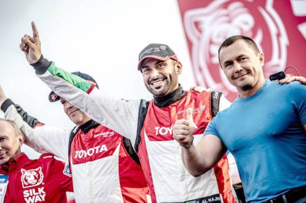 لقطة لبطل الراليات يزيد الراجحي مع أعضاء فريقه.