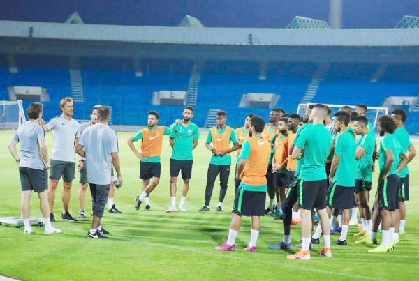 مدرب المنتخب السعودي رينارد في اجتماع سابق مع اللاعبين.