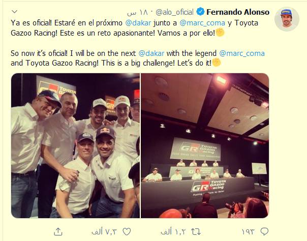 وكتب بطل العالم السابق لـ(لفورمولا1) على موقعه الرسمي على تويتر «الآن، أصبح رسمياً! سأشارك في دكار المقبل مع الأسطوري مارك كوما وتويوتا غازو رايسينغ. إنه تحد كبير...».