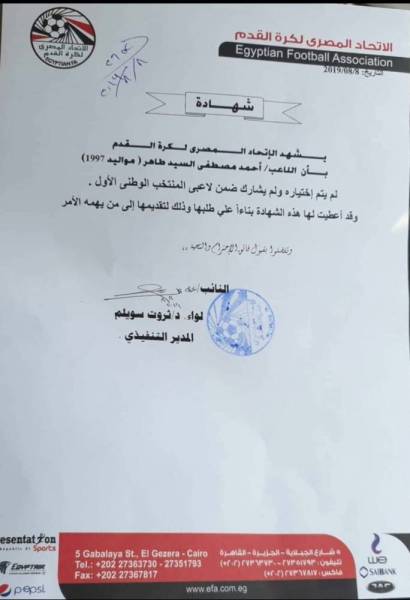 في المقابل، تستند إدارة نادي أبها على خطاب من الاتحاد المصري لكرة القدم يؤكد عدم مشاركة اللاعب أحمد مصطفى مع المنتخب المصري الأول.