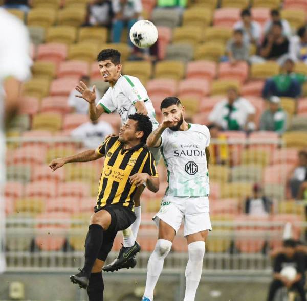 كرة عالية يحاول لاعبو الفريقين اقتناصها.