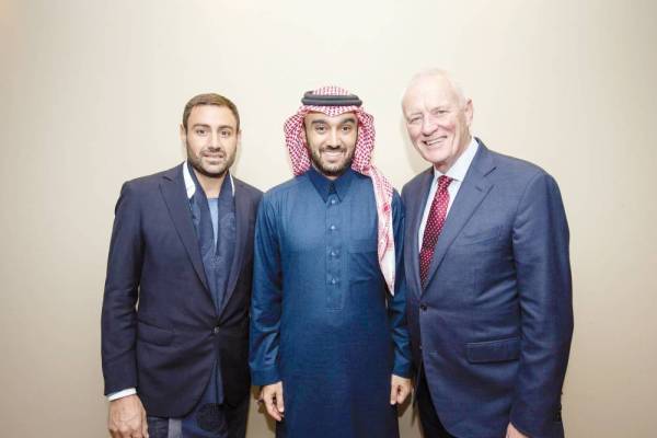 رئيس هيئة الرياضة الأمير عبدالعزيز بن تركي الفيصل مع رئيس إدارة بطولة العالم للسنوكر باري هيرن والمدير التنفيذي للشركة المسوقة كارلو بوتاجي.