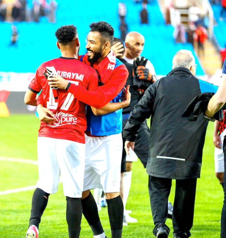 لاعبو الرائد يتبادلون التهاني بعد الفوز على العدالة.