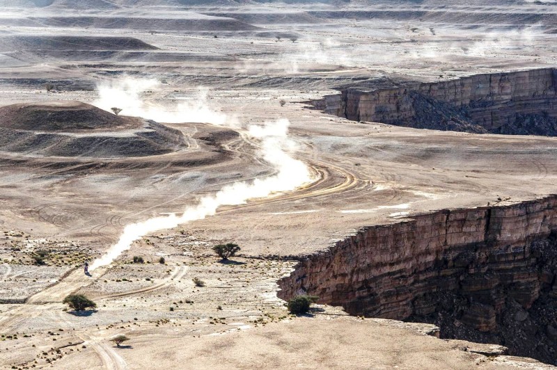 دراج يقطع تضاريس المرحلة التاسعة (وادي الدواسر - حرَض) من رالي داكار السعودية 2020 أمس.
