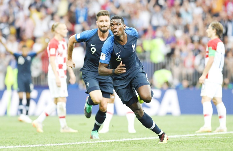 الفرنسي بوغبا ينطلق فرحا بهدفه في نهائي كأس العالم.
