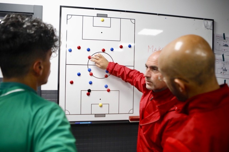 المدرب الجديد يشرح لأحد اللاعبين في معسكر برشلونة.