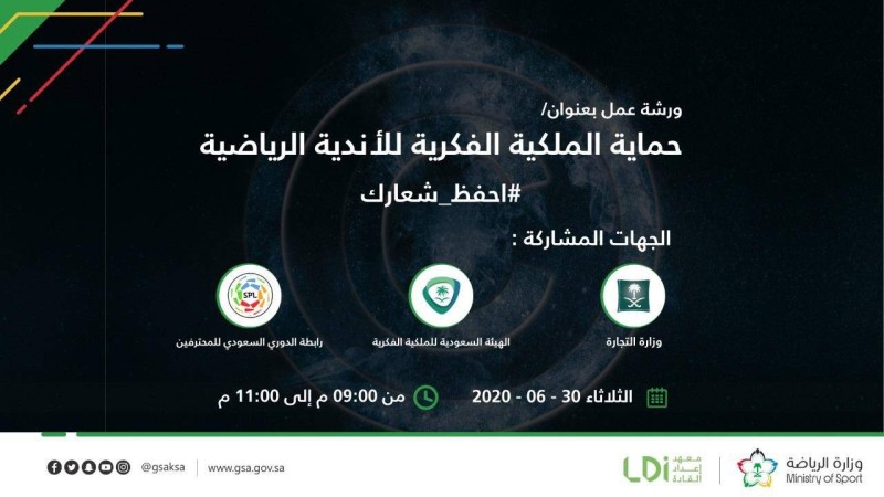 تُقيم الإدارة العامة للاستثمار بوزارة الرياضة، وبالتعاون مع معهد إعداد القادة عند التاسعة من مساء غدٍ (الثلاثاء)، ورشة عمل (عن بُعد) بعنوان: حماية الملكية الفكرية للأندية الرياضية «#احفظ_شعارك»، وذلك بمشاركة عددٍ من الجهات المعنية مثل وزارة التجارة، الهيئة السعودية للملكية الفكرية، ورابطة دوري المحترفين السعودي.