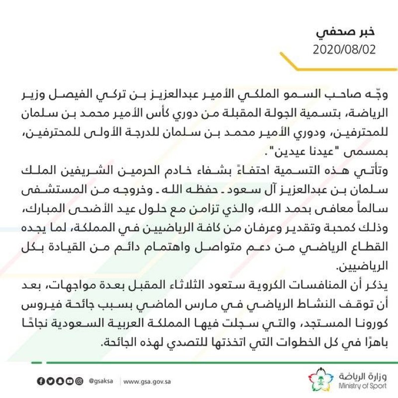 وجّه وزير الرياضة الأمير عبدالعزيز بن تركي الفيصل بتسمية الجولة القادمة من دوري كأس الأمير محمد بن سلمان للمحترفين، ودوري الأمير محمد بن سلمان للدرجة الأولى للمحترفين، بمسمى «عيدنا عيدين».