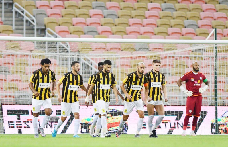 فرحة لاعبي الاتحاد بهدف المولد في مرمى الاتفاق .