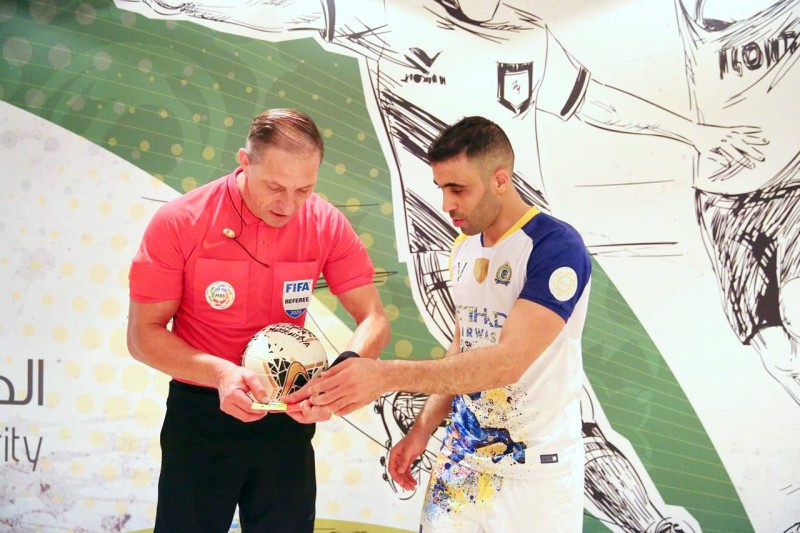 حمدالله يتسلم كرة الهاتريك من حكم اللقاء.