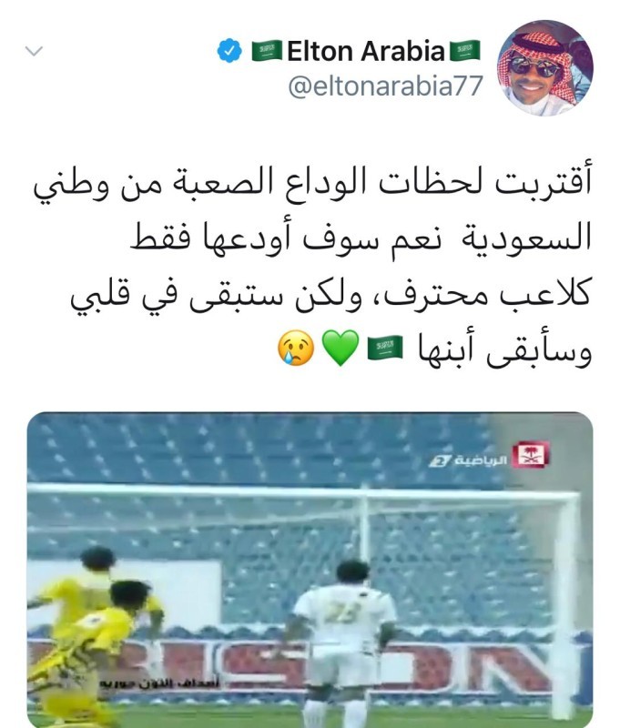 أعلن المحترف البرازيلي في صفوف الوحدة إلتون جوزيه اقتراب موعد رحيله عن الدوري السعودي، وذلك في تغريدة كتبها باللغة العربية عبر حسابه على «تويتر»، قال فيها: «اقتربت لحظات الوداع الصعبة لوطني السعودية، نعم سأودعها فقط كلاعب محترف، ولكن ستبقى في قلبي وسأبقى ابنها»، في إشارة منه إلى مغادرة الملاعب السعودية كلاعب محترف بعد نهاية الموسم الرياضي الحالي مع فريقه الوحدة.