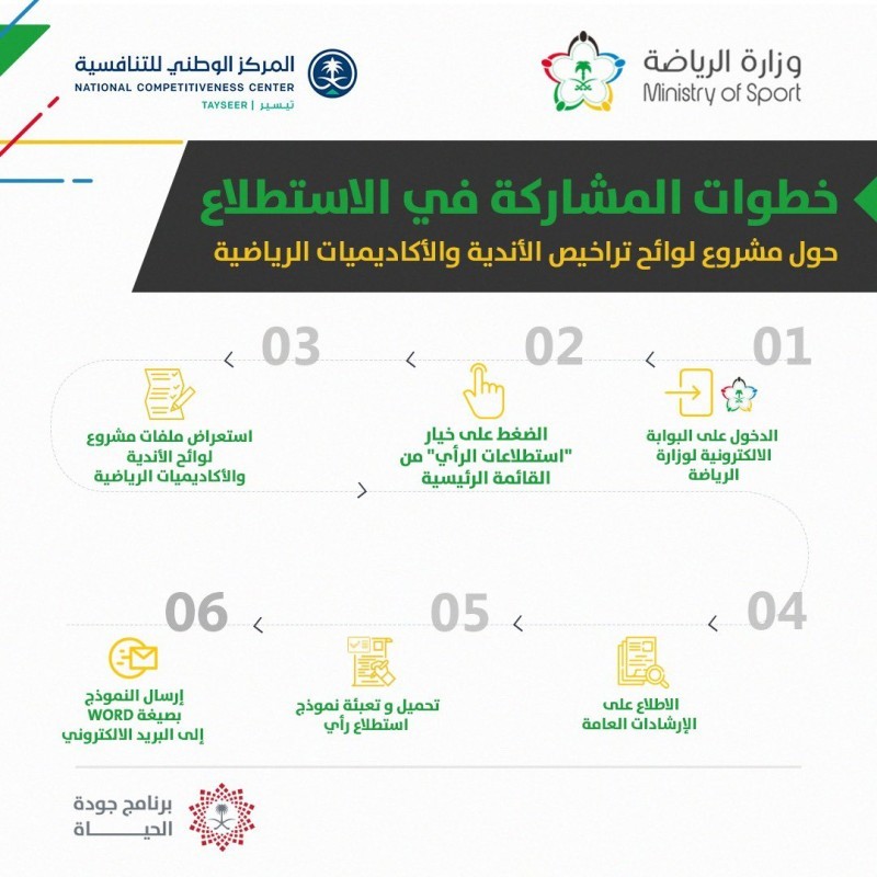 ودعت الوزارة كافة المهتمين والمستثمرين والعاملين بالقطاع الرياضي إلى المشاركة بشفافية في هذا الاستطلاع، الذي ستؤدي نتائجه دورا في الخطة المقترحة حول إجراءات تراخيص الأندية والأكاديميات والمراكز الرياضيّة الخاصة.