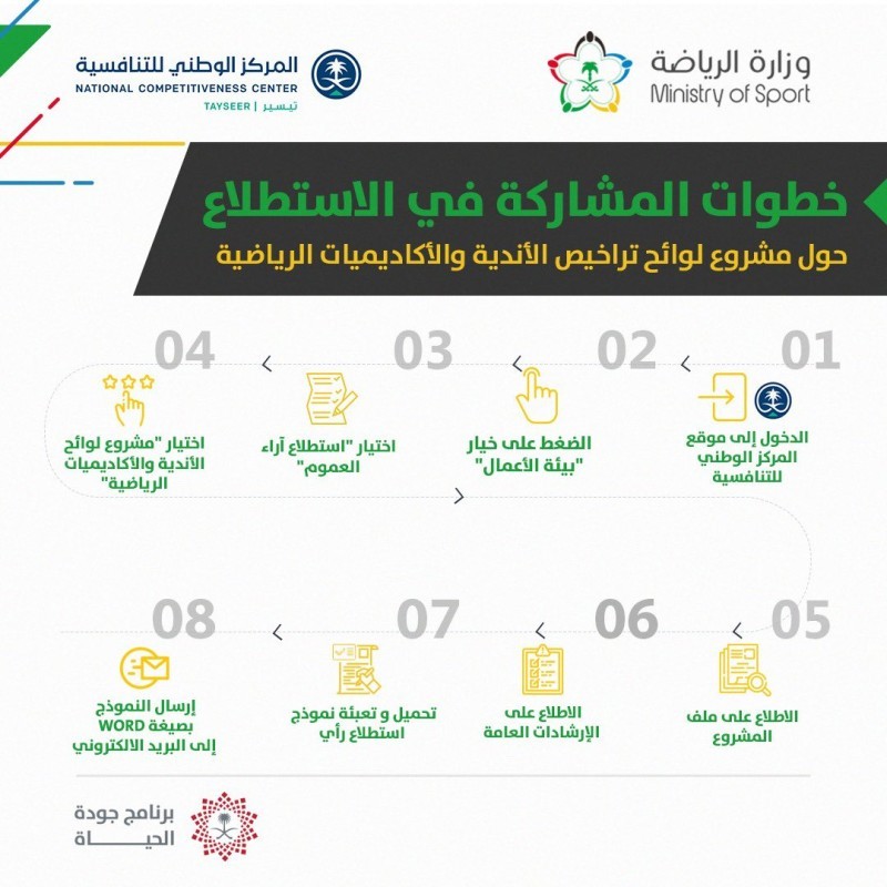 وستتاح الفرصة للمهتمين بذلك للاطلاع على لائحة المشروع وإبداء مرئياتهم بما يتعلّق بضوابط اللائحة وآلية ومتطلبات التقديم، عبر تحميل وثيقة الاستطلاع وتعبئتها، ومن ثم إرسالها إلى البريد الإلكتروني Pc@ncc.gov.sa، إذ سيكون متوفرا على موقع وزارة الرياضة على الرابط التالي: https://www.mos.gov.sa/ar/Pages/RegulationsSurvey.aspx وموقع المركز الوطني للتنافسيّة على الرابط التالي: https://www.ncc.gov.sa/ar/Business/PublicConsultation/Pages/default.aspx ابتداءً من اليوم، وحتّى الإثنين القادم 21 سبتمبر 2020.