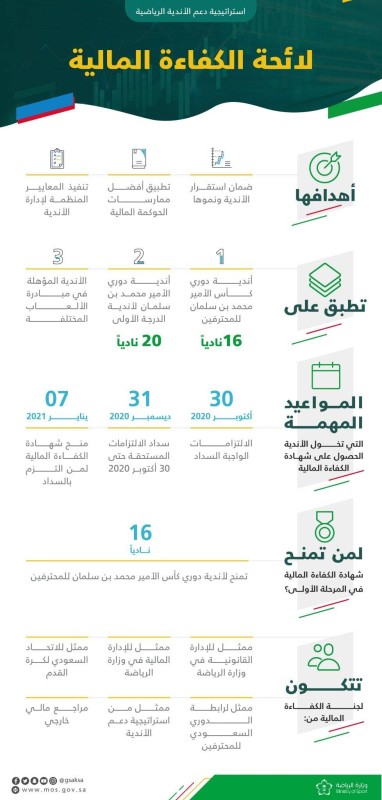 وتختص اللائحة في مرحلتها الأولى، بأندية دوري كأس الأمير محمد بن سلمان للمحترفين (16 نادياً)، وأندية دوري الأمير محمد بن سلمان للدرجة الأولى (20 نادياً)، إضافة إلى الأندية المؤهلة ضمن مبادرة الألعاب المختلفة، فيما ستمنح شهادة الكفاءة المالية في المرحلة الأولى لأندية دوري كأس الأمير محمد بن سلمان للمحترفين، في حال وفائها بسداد الالتزامات المالية المستحقة حتى 30 أكتوبر 2020، على أن يكون سداد تلك الالتزامات قبل 31 ديسمبر 2020، فيما سيتم إصدار شهادة الكفاءة المالية للأندية المستحقة بتاريخ 7 يناير 2021.