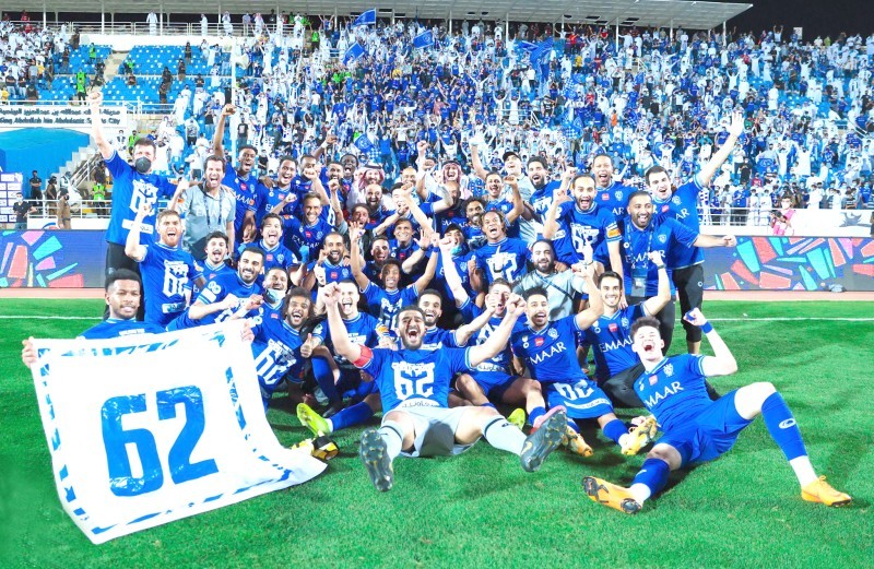 احتفالية فريق الهلال عقب الفوز على التعاون بهدف مقابل لا شيء أمس الأول في بريدة ضمن الجولة ما قبل الأخيرة بالدوري.