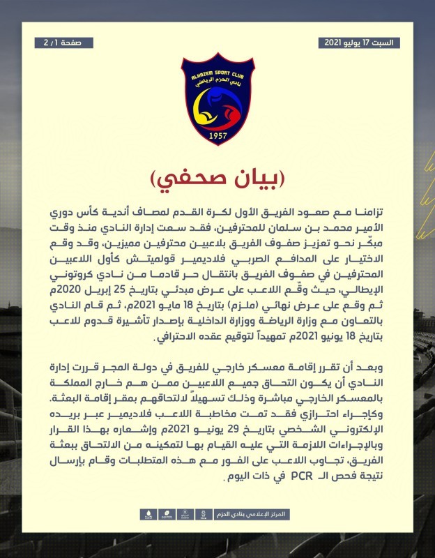 وبناء على ذلك رفضت إدارة الحزم التنازل عن حقوقها، وستتخذ كافة الإجراءات النظامية بحق اللاعب لرد اعتبار النادي.