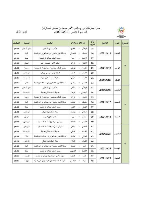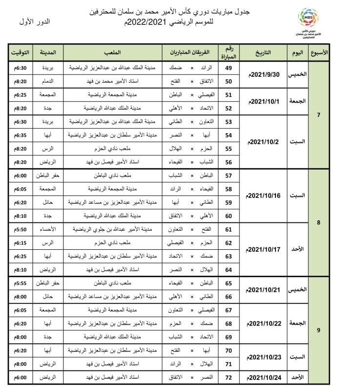 أهم مواعيد مباريات الدور الأول من بطولة الدوري السعودي للمحترفين لموسم 2021-2022: