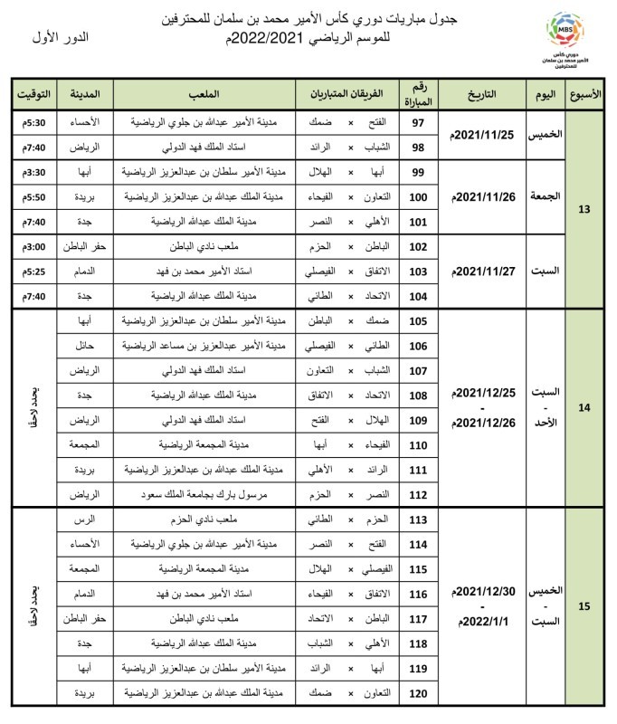 وقالت اللجنة إنه سيتم تحديد مواعيد مباريات الجولتين (14 و15) خلال الأيـام والمواعيد الزمنية المذكورة في الجدول لاحقا، وذلك بعد صدور جدول مباريات كأس خادم الحرمين الشريفين 2022/2021.
