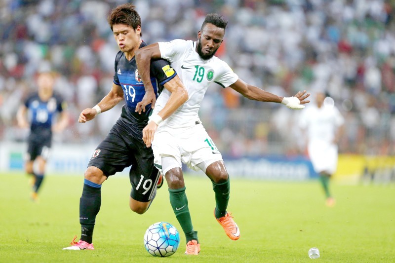 فهد المولد يقاتل على الكرة مع هيروكي ساكاي لاعب منتخب اليابان، في المباراة التاريخية التي جمعت المنتخبين في تصفيات مونديال 2018. (رويترز)