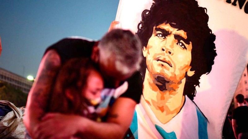 أب وابنته يبكيان في يوم وفاة الأسطورة دييجو مارادونا في بوينوس إيرس في 25 نوفمبر من العام الماضي. (AFP)