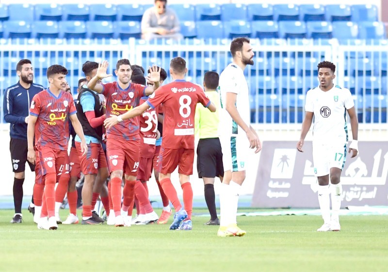 فرحة لاعبي أبها بعد إحراز الهدف الثاني في الدقيقة 85 وتبدو الخيبة على لاعبي الأهلي. (spl)