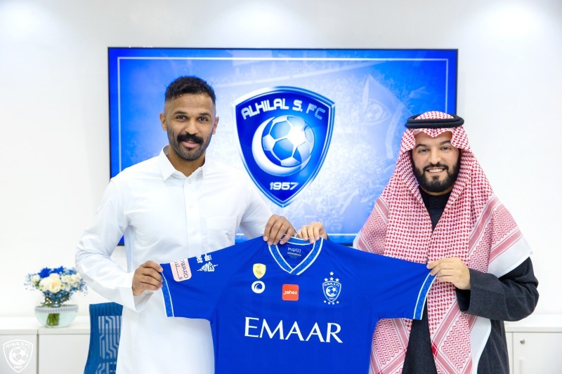 العويس مع رئيس الهلال فهد بن نافل بعد مراسم التوقيع.