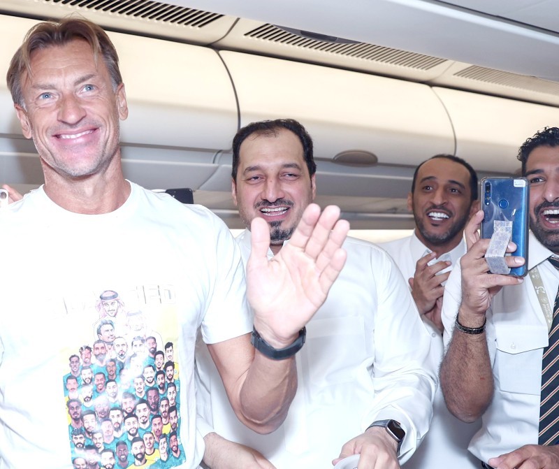 فرحة رئيس الاتحاد السعودي ياسر المسحل ومدرب الأخضر رينارد بالوصول لكأس العالم 2022.