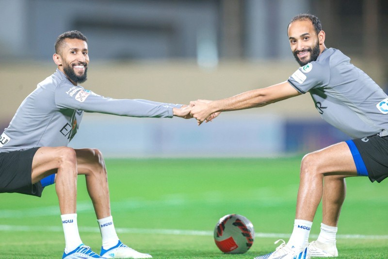 قائد فريق الهلال سلمان الفرج وعبدالله عطيف في التدريبات.