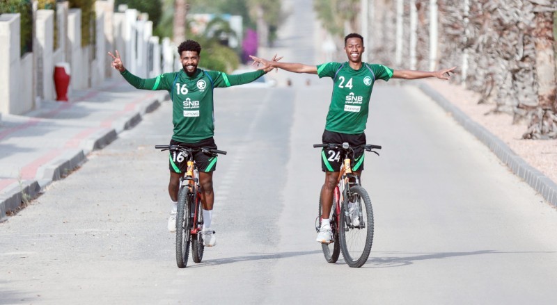 ناصر الدوسري وسامي النجعي يتجولان بالدراجة في طريقهما لمقر التدريب.