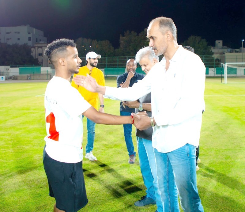 عبدالهادي الحداد خلال لقائه لاعبي الأهلي بصحبة عدد من لاعبي النادي السابقين.