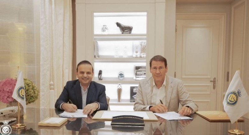 رئيس نادي النصر مسلي آل معمر والمدرب الفرنسي جارسيا أثناء مراسم توقيع العقد.