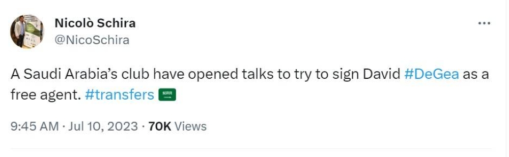 وكشف الصحفي الإيطالي نيكولو شيرا أن دي خيا دخل دائرة اهتمام أحد الأندية السعودية الذي يسعى للظفر بخدمات الحارس الإسباني بعد نهاية رحلته الكروية مع مانشستر يونايتد بصورة رسمية.