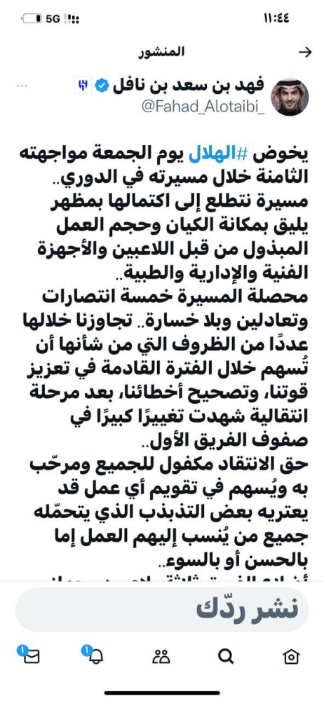 وكتب بن نافل «يخوض الهلال يوم الجمعة مواجهته الثامنة خلال مسيرته في الدوري، مسيرة نتطلع إلى اكتمالها بمظهر يليق بمكانة الكيان وحجم العمل المبذول من قبل اللاعبين والأجهزة الفنية والإدارية والطبية، محصلة المسيرة خمسة انتصارات وتعادلين وبلا خسارة، تجاوزنا خلالها عدداً من الظروف التي من شأنها أن تُسهم خلال الفترة القادمة في تعزيز قوتنا، وتصحيح أخطائنا، بعد مرحلة انتقالية شهدت تغييراً كبيراً في صفوف الفريق الأول».
