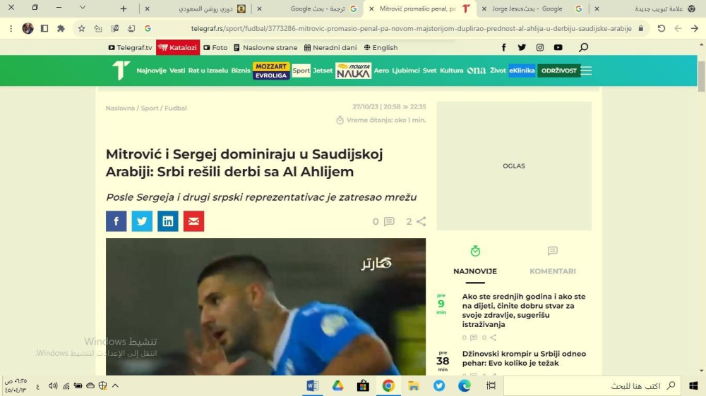«عكاظ» رصدت عدداً من ردات فعل الصحف الصربية حول تميز «ابن موطنها» هداف المنتخب ونادي الهلالي ميتروفيتش، بداية قالت صحيفة «novosti»: ألكسندر ميتروفيتش لا يزال يبهر العالم والهلاليين والرياضيين هناك بالدوري السعودي من خلال تحركاته، وأهدافه التي لا يراها حراس المرمى إلا وهي تسكن شباكهم الواحد تلو الآخر.