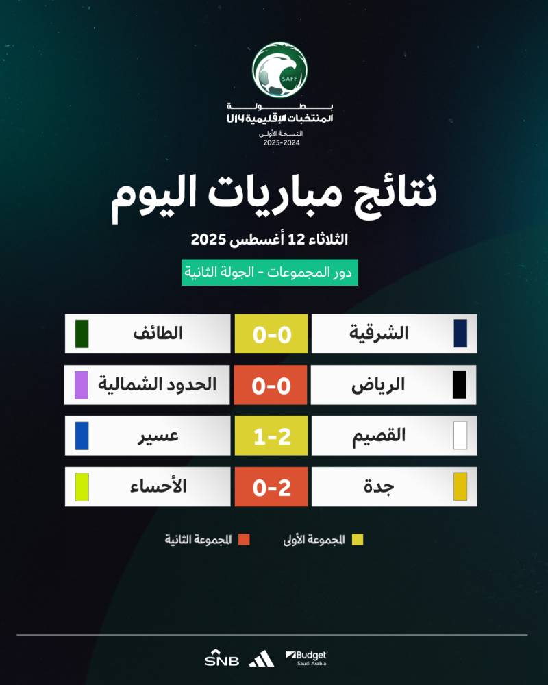 In the first match, Riyadh's team drew with the Northern Borders team with a score of 0-0, and the same result was seen in the match between Eastern Province and Taif. In the third match, Qassim won against Asir with a score of 2-1, with goals scored by Abdulrahman Al-Anzi and Fares Al-Mabrouk, while Elias Al-Salem scored Asir's only goal. In the final match of yesterday, Jeddah's team defeated Al-Ahsa team with a score of 2-0, with goals from Marwan Al-Muallad and Yahya Mansour. Jeddah's team includes 9 players from Al-Ahli Club and 8 players from Al-Ittihad Club.