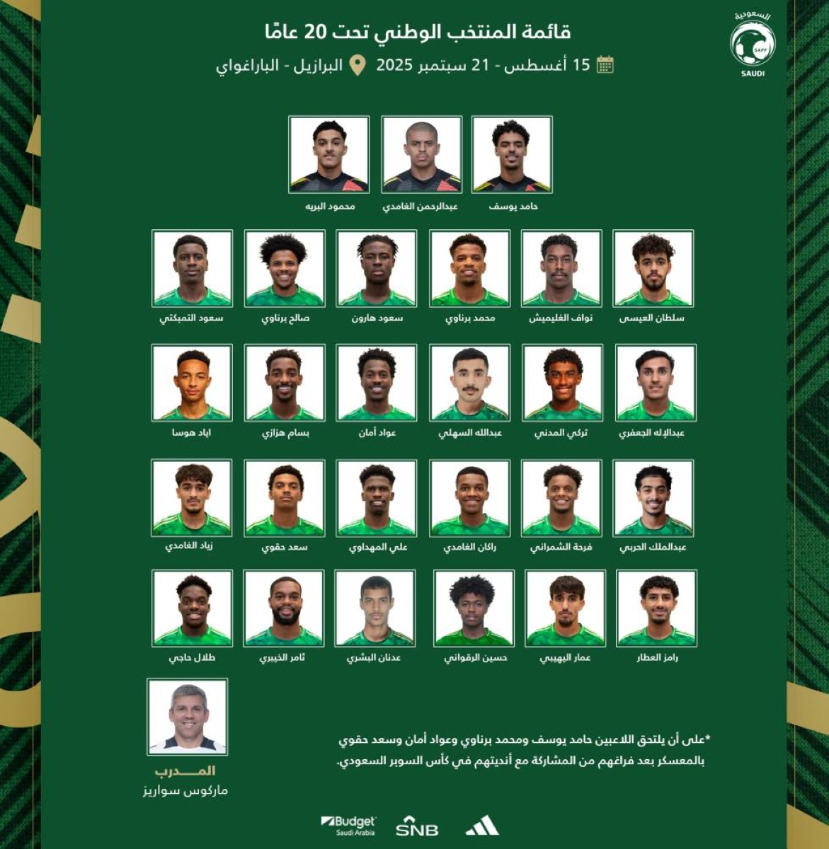 The coaching staff of the Saudi U-20 team, led by coach Marcos Suarez, announced the final list of players who will participate in the 2025 FIFA U-20 World Cup scheduled to be held in Chile. The list includes 27 players: Hamad Youssef Al-Shanqeeti, Abdulrahman Al-Sanai, Mahmoud Al-Dweih, Sultan Al-Eissa, Nawaf Al-Shalhoub, Mohammed Barnawi, Saud Haroun, Saleh Barazi, Saud Al-Mashikhi, Abdullah Al-Jaafari, Turki Al-Muhani, Abdullah Al-Suhaili, Awad Aman, Bassam Hazzazi, Iyad Moussa, Ziad Al-Qadami, Saad Haqwi, Ali Al-Mahdi, Rafel Al-Qadami, Fahd Al-Shurman, Abdulmalik Al-Harbi, Rami Al-Attar, Ammar Al-Habees, Hussein Al-Qurashi, Adnan Al-Shammari, Thamer Al-Dubibi, and Talal Naji.