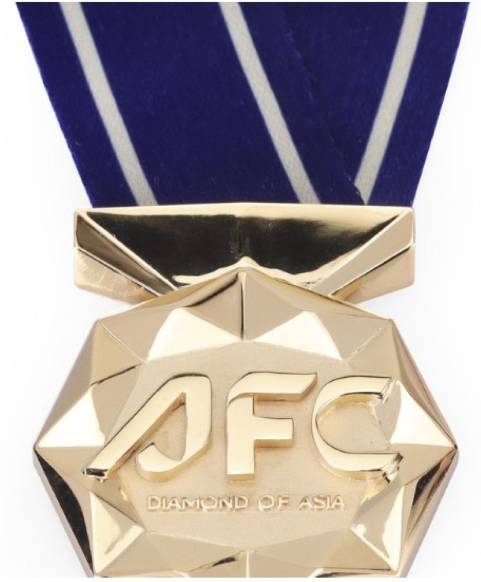 This medal is a masterpiece that embodies excellence and highlights the richness of Asian culture, taking the form of an elegant eight-sided diamond that reflects luxury and prominently displays the new AFC logo at its center in a striking harmony. A blue and gold ribbon has been used to reflect its high status, alongside a luxurious pin featuring the same diamond design details coated in gold, centered with a large diamond piece that uniquely reflects light, giving the medal a striking and balanced presence at the same time.