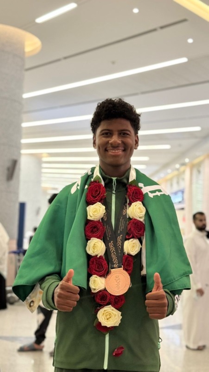 Naif Mohsen Al-Sumairi, a player on the Saudi national team, confirmed to "Okaz" upon his arrival in Jeddah that the bronze medal he won in the final of the 110-meter hurdles with a time of 14.12 seconds at the 2025 Asian Youth Games in Manama is a simple gift to the homeland, and God willing, it will be a great motivation to achieve a significant accomplishment for the country by winning the gold medal in upcoming competitions.