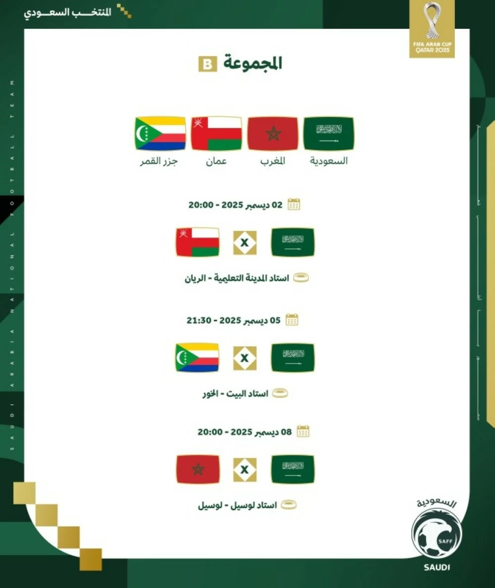 Thus, the second group is completed with the presence of the Saudi team alongside the Moroccan team, in addition to the teams of Oman and Comoros. The schedule for our Saudi national team's matches is as follows: they will begin their journey on Tuesday, December 2, facing Oman at the Education City Stadium at 8:00 PM, while they will face Comoros on Friday, December 5, at Al-Bayt Stadium at 9:30 PM, and will conclude group matches on Monday, December 8, against Morocco at Lusail Stadium at 8:00 PM.