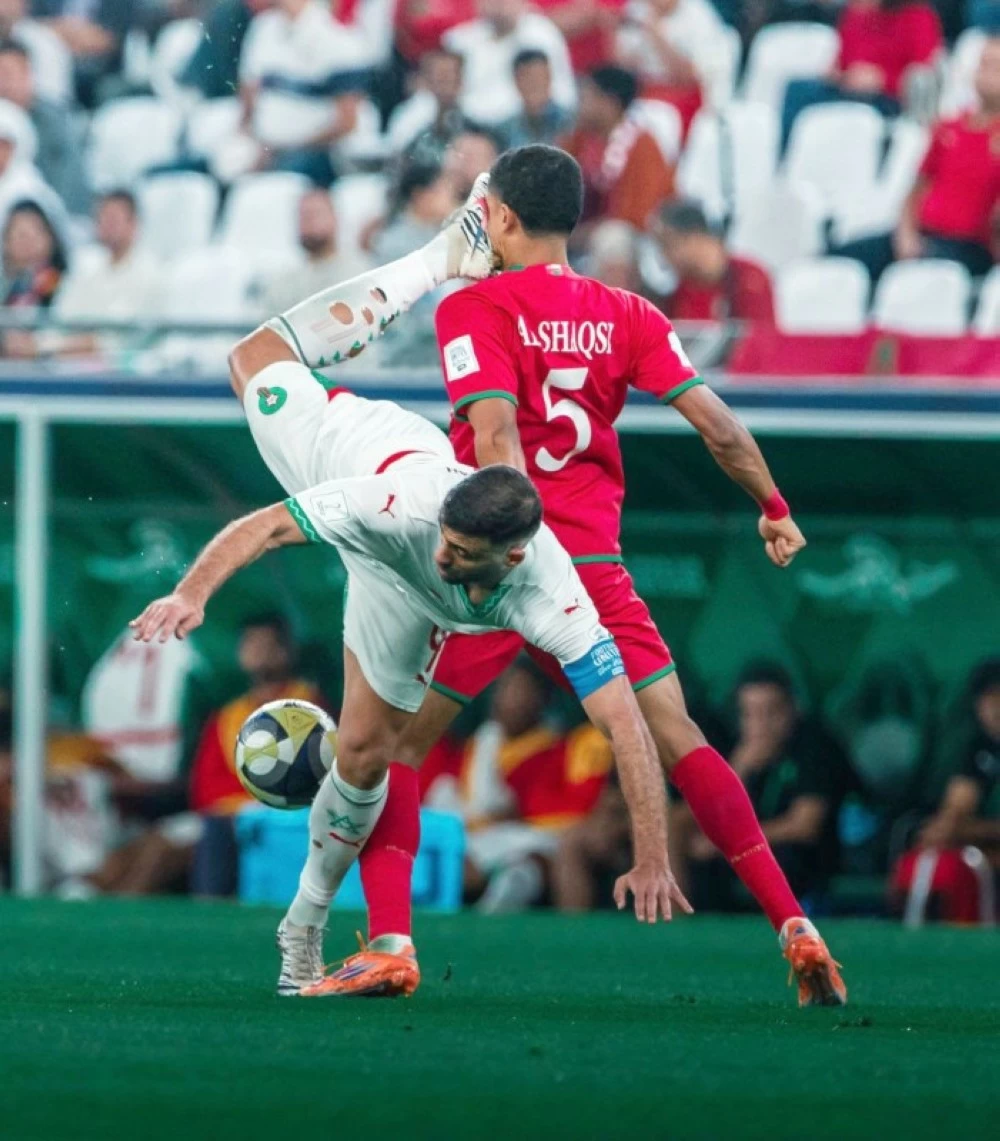 Sources from "Okaz" have learned that Morocco's national team captain, Abderrazak Hamdallah, will be suspended for two matches by the disciplinary committee for the Arab Cup 2025 in Qatar, following his direct red card in the match against Oman today (Friday), which ended in a goalless draw. Hamdallah was sent off after a violent tackle on Omani defender Hani Al-Rashidi in the 53rd minute of the match held at the Education City Stadium in Qatar. This tackle is punishable by law with a two-match suspension, meaning Hamdallah will miss the match against the Saudi national team in the third round of the tournament.