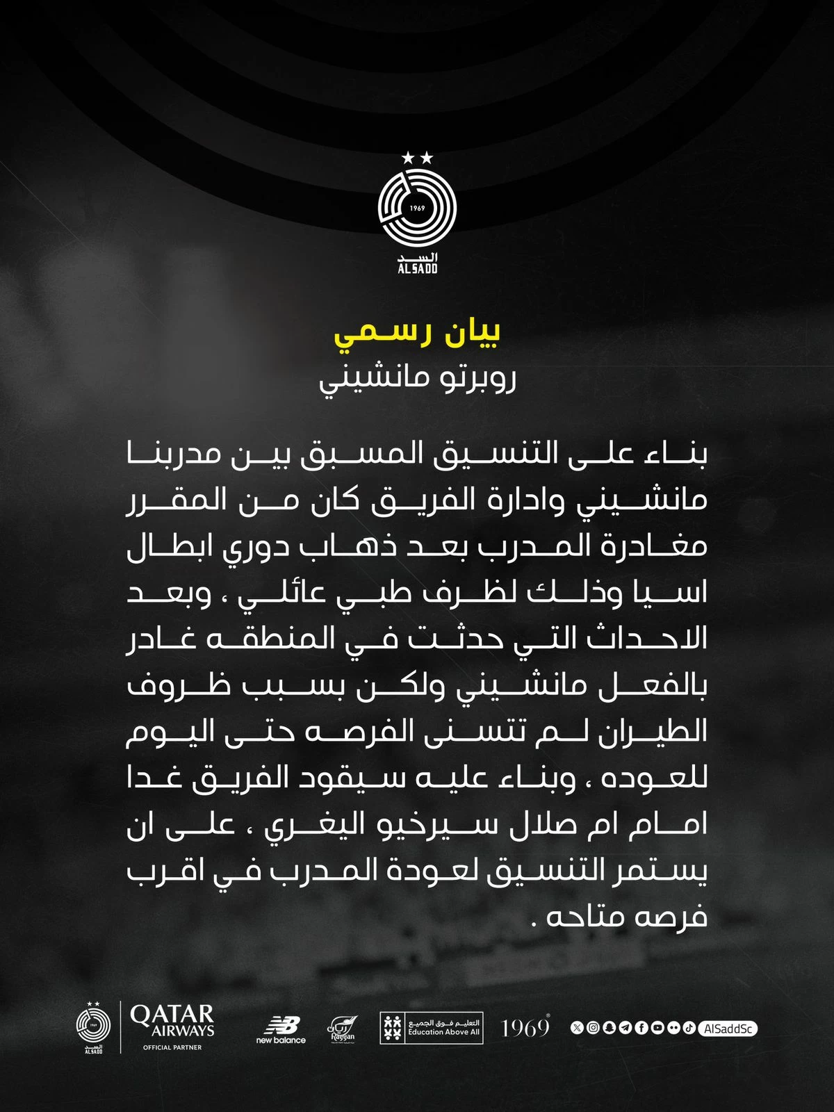 as the club announced that its Italian coach Roberto Mancini could not arrive in Doha to lead the team, after he had left for his home country earlier due to a family medical circumstance, but he was unable to return because of the events in the region. The club announced that his assistant, Sergio Allegri, would lead the team until the coach's return.