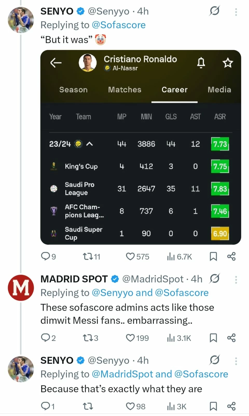فبعد هجوم عشاق النجم البرتغالي على الموقع جراء ما تداولته حسابات عالمية وصحفيون حول حذف موقع الإحصاءات الأهداف الستة، وهو ما أشارت إليه «عكاظ» وقتها، تراجع الموقع وأعاد الأهداف الستة في سجل اللاعب التهديفي، قبل أن يُصدر بياناً إعلامياً عبر حسابه في «X»، بدأه بعبارة: «ويبقى هذا هو الحال إلى أن يقول الفيفا خلاف ذلك»، ومن ثم جاء ما يلي: «لطالما كانت بطولة كأس أبطال الأندية العربية 2023 موجودة في قاعدة بياناتنا، وستظهر الأهداف الستة التي سجلها كريستيانو رونالدو في تلك البطولة في علامة التبويب «المسيرة» بعد تحديثها، 967 هدفاً – هذا هو الرقم، وهذا هو رصيد رونالدو على موقعنا.