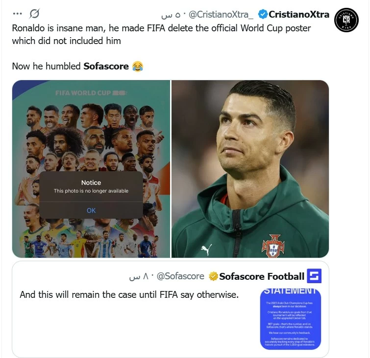 After fans of the Portuguese star attacked the site due to what was circulated by global accounts and journalists about the deletion of the six goals, which was mentioned by "Okaz" at the time, the site retracted and restored the six goals to the player's scoring record. It then issued a press statement via its account on "X," starting with the phrase: "This remains the case until FIFA says otherwise," followed by: "The Arab Club Champions Cup 2023 has always been in our database, and the six goals scored by Cristiano Ronaldo in that tournament will appear in the 'Career' tab after it is updated. 967 goals – that is the number, and that is Ronaldo's tally on our site.