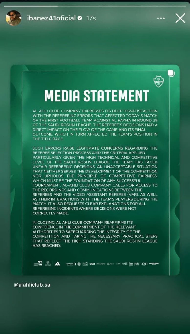 A defender for Al-Ahli, Roger Ibanez, reposted the official statement issued by his club following his team's match against Al-Faihah on his Instagram account. The match had sparked widespread controversy over some refereeing decisions.