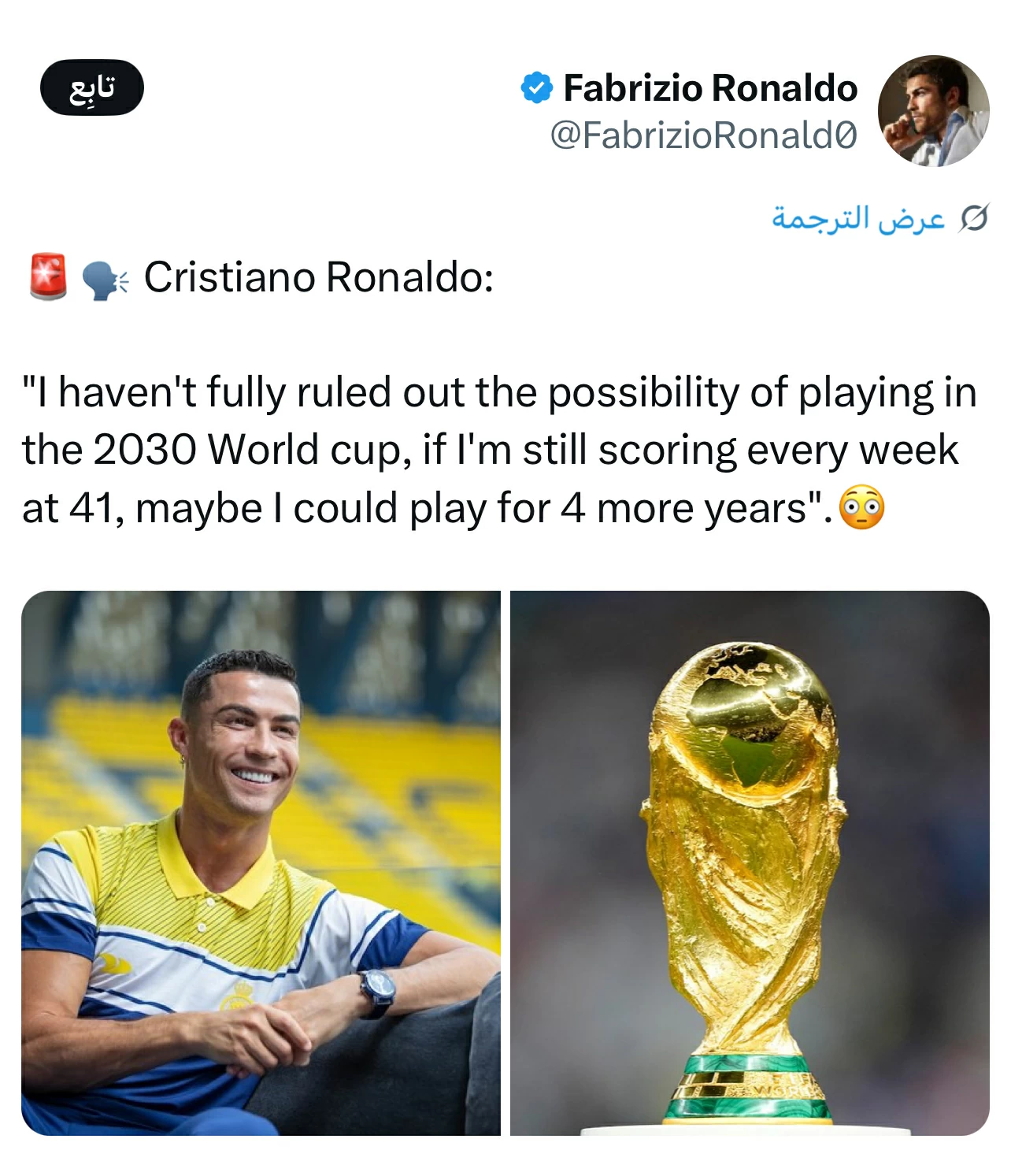 في كل مرة يثبت قائد المنتخب البرتغالي ونادي النصر «كريستيانو رونالدو»، أنه نجم استثنائي رغم بلوغه سن الأربعين، إلا أنه لا يزال يتمتع بلياقة عالية وأنه قادر على العطاء داخل المستطيل الأخضر، ويطمح أن يقود منتخب بلاده في مونديال 2026 المقرر إقامته خلال الفترة من 11 يونيو إلى 19 يوليو في أمريكا وكندا والمكسيك، وكذلك مونديال 2030، طالما أنه قادر على هز الشباك والركض في المستطيل الأخضر. وقال: «لم أستبعد تمامًا إمكانية مشاركتي في مونديال 2030، طالما أسجل هدفًا كل أسبوع في سن الـ 41، ربما يمكنني اللعب لمدة 4 سنوات أخرى»، حيث لقي هذا التصريح تفاعلاً كبير من أنصاره في منصات التواصل الاجتماعي.