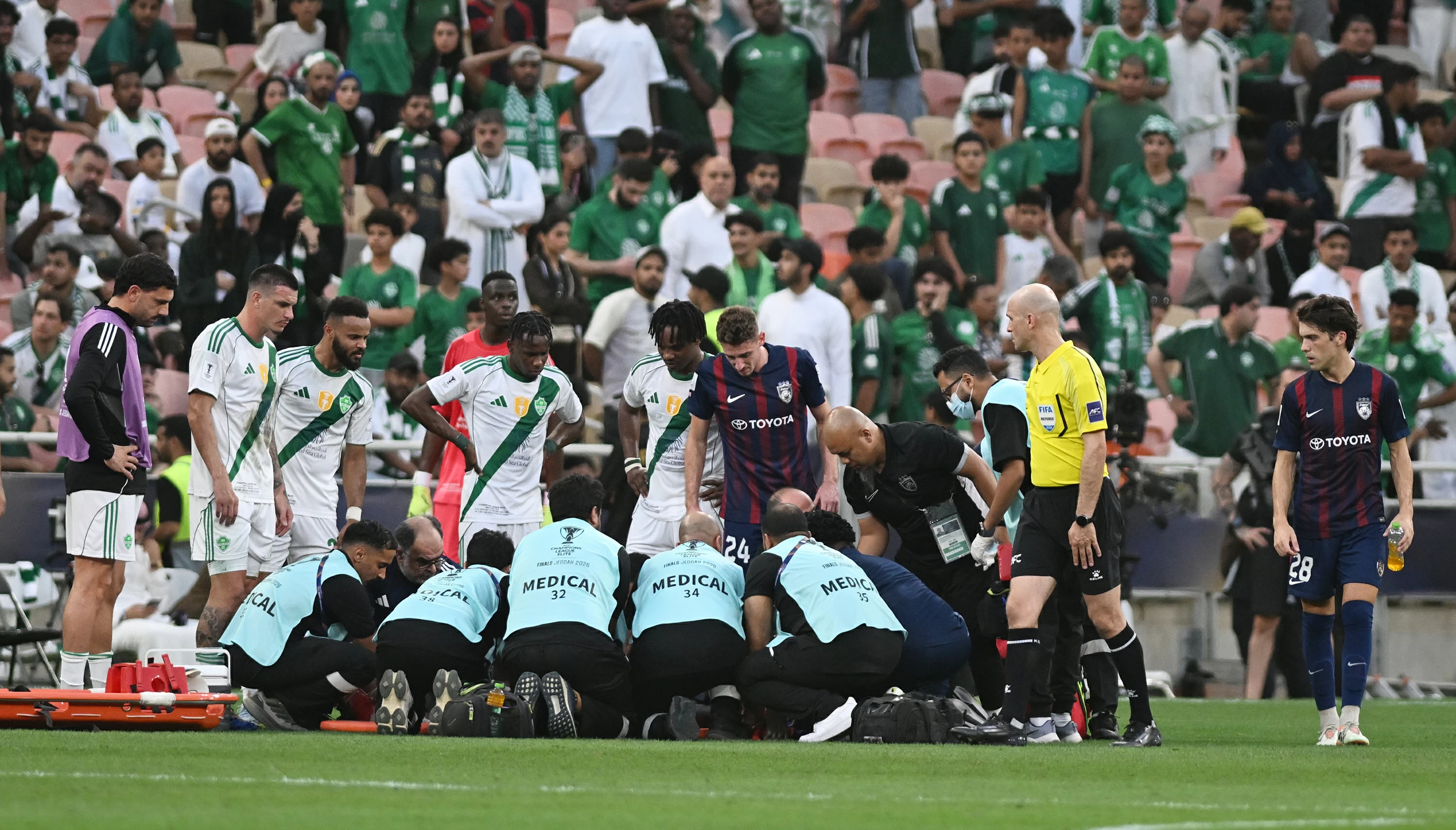 The Malaysian team's striker "Dislava" suffered a serious injury due to a strong collision with the Al-Ahli defender Ali Majrashi during the first half of the match between the two teams held at King Abdullah Sports City in Jeddah, as part of the quarter-finals of the AFC Champions League. The player lost consciousness and was transported to the nearest hospital for necessary examinations to determine the nature of the injuries he is suffering from in the neck and face. Initial tests indicate that the player is experiencing dizziness, loss of consciousness, and a severe delay in reaction time, while the Jordanian referee "Adham Makadmeh" issued a red card to the Al-Ahli player.