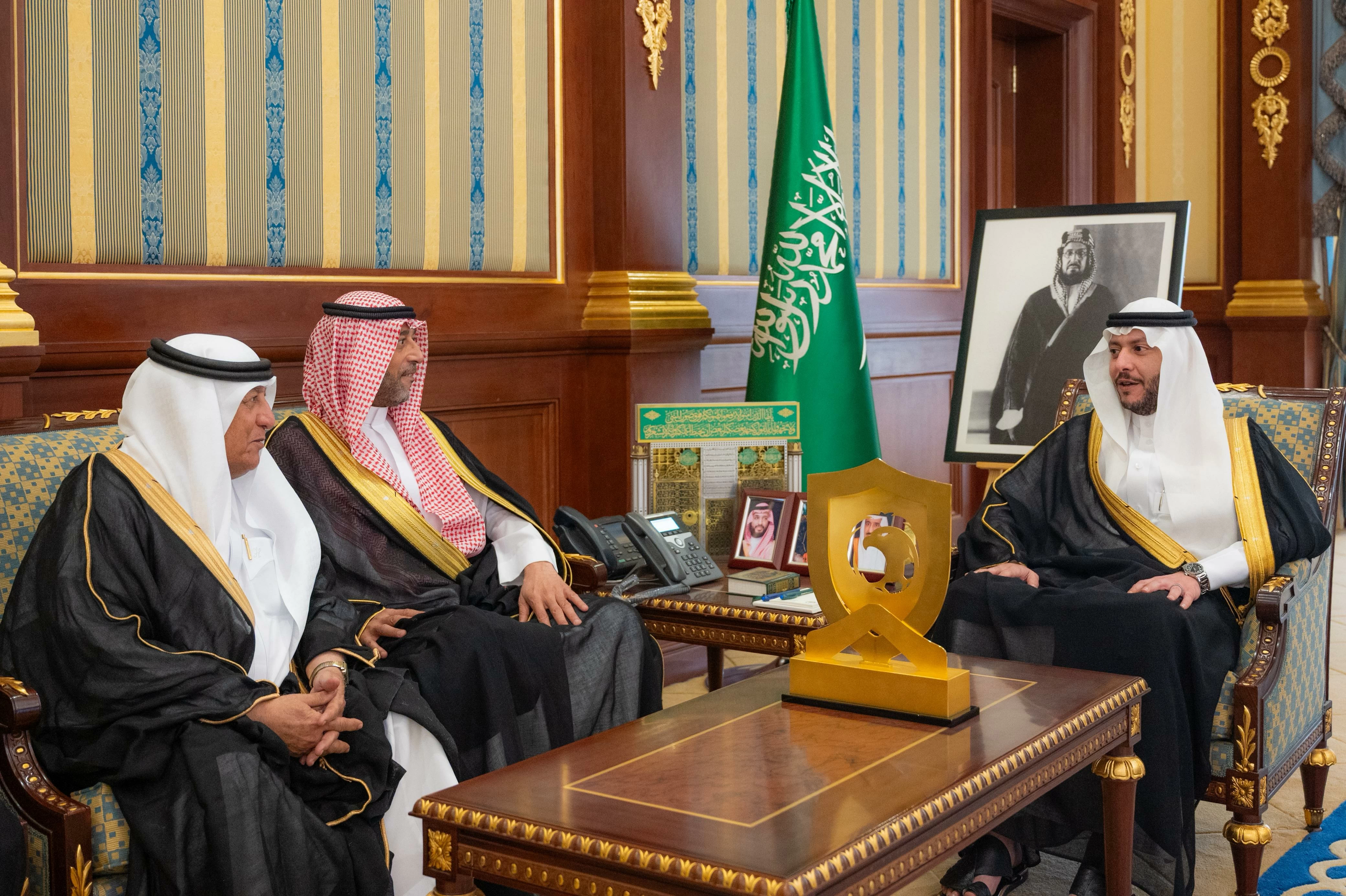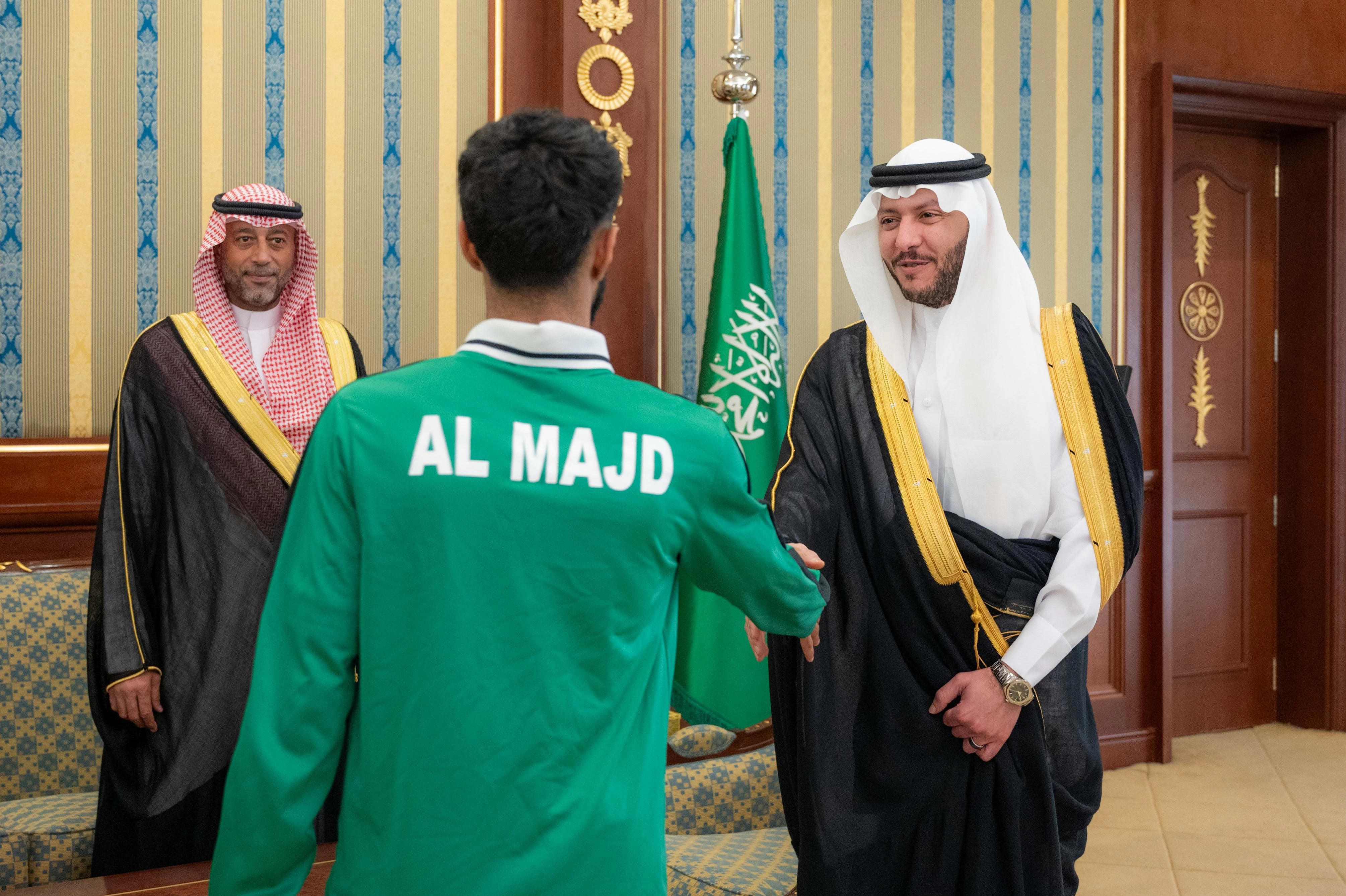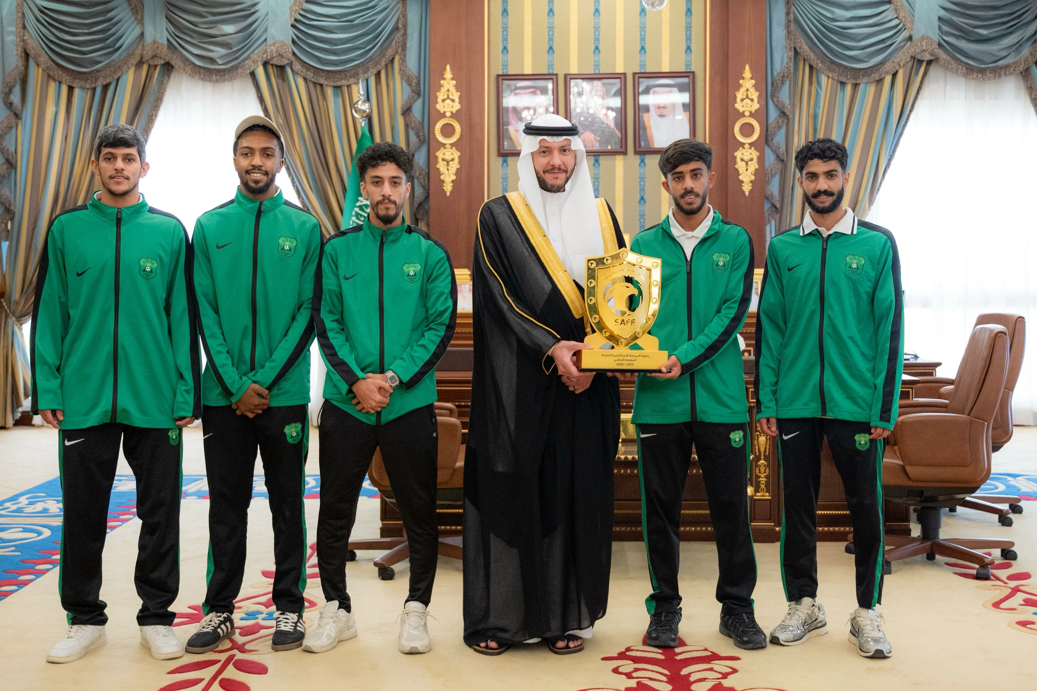 Prince Saud bin Nahar bin Saud bin Abdulaziz, the Deputy Emir of the Medina Region, received in his office the Chairman of the Al-Majd Sports Club, Abdulwahab Al-Ghafari, along with several club members, on the occasion of the first football team's achievement of the Kingdom's Championship for Fourth Division Clubs, in the presence of the Director of the Ministry of Sports branch in the region, Hatem Abu Salama.