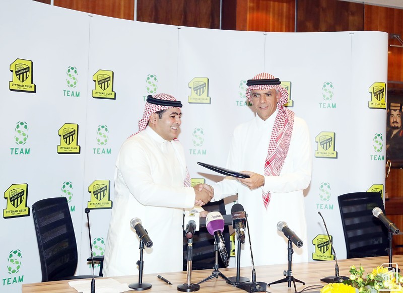 جانب من توقيع العقد الاستثماري لنادي الاتحاد نهاية الموسم الماضي.