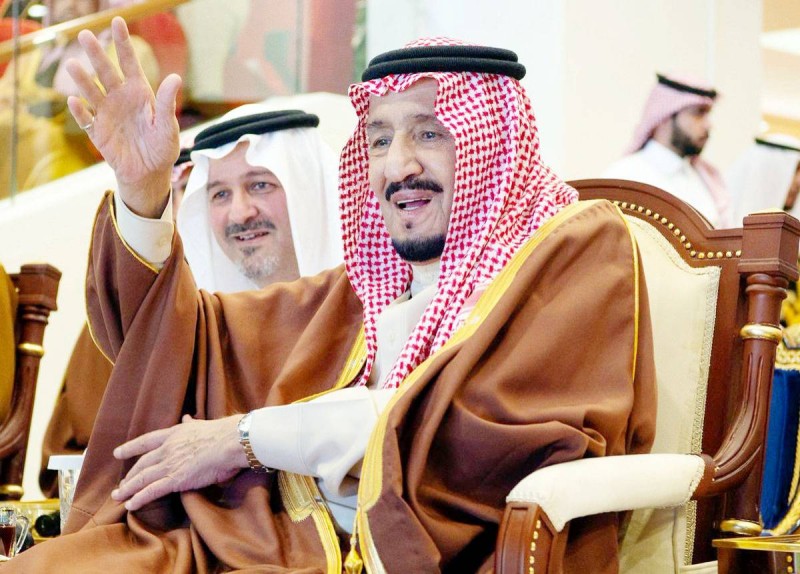 الملك سلمان بن عبدالعزيز، حفظه الله، يحيي الجماهير خلال رعايته لحفل سابق للفروسية الموسم الماضي.