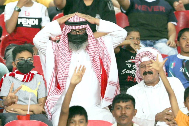 مشجع وحداوي وابنه يضعان كمامتين أثناء متابعتهما مباراة فريق الوحدة وضمك في الجولة الماضية. (عكاظ)